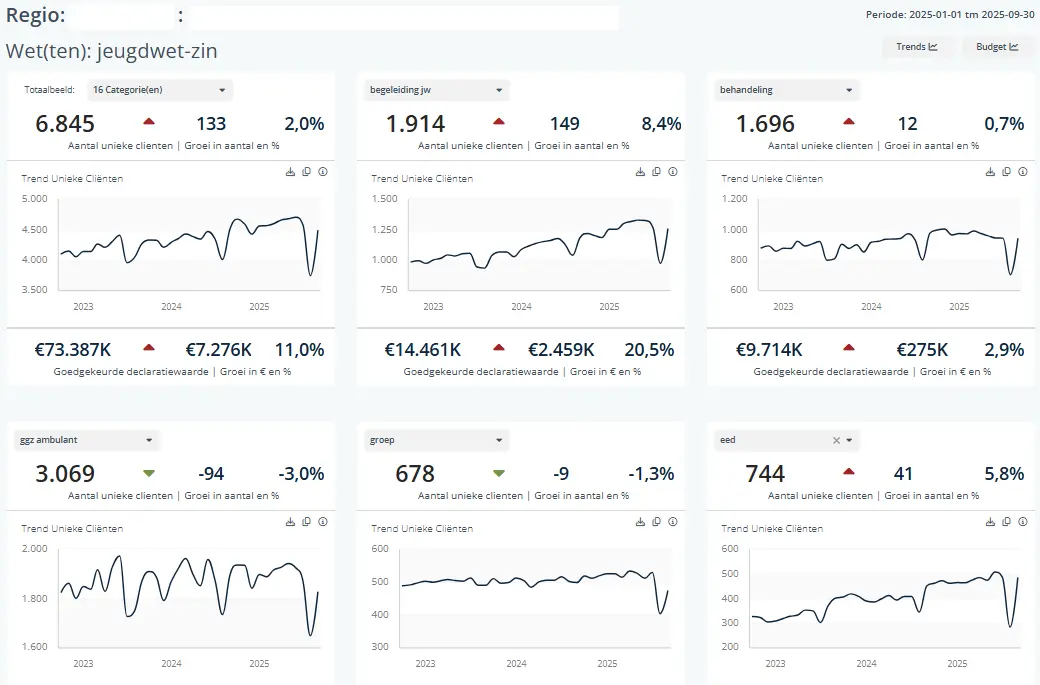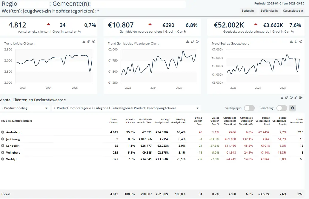 Het trendrapport toont de ontwikkeling in de tijd: hoe het aantal unieke cliënten, de gemiddelde kosten per cliënt en de totale declaratiewaarde zich door de tijd heen veranderen. Zo kun je groei en krimp vanuit verschillende perspectieven analyseren, bijvoorbeeld per productcategorie of per aanbieder. De gegevens zijn uitgewerkt op vier detailniveaus, waardoor je vanuit het totaalbeeld stap voor stap kunt inzoomen op de onderliggende details.