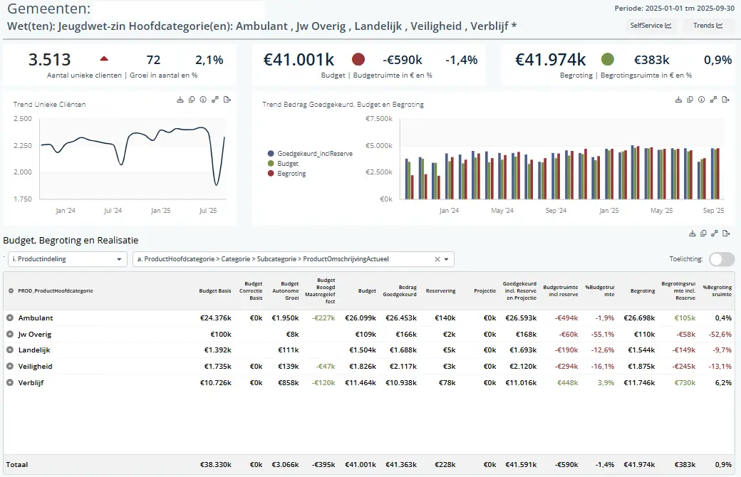 Het budgetrapport laat zien hoe de gerealiseerde kosten zich verhouden tot het beschikbare budget en de begroting, per gemeente en per productcategorie. Je kunt hier volgen of de uitgaven op koers liggen, welke onderdelen achterblijven of juist harder groeien dan voorzien en – met behulp van een eindejaarsprojectie – een inschatting maken van het verwachte resultaat aan het eind van het jaar, zodat tijdig kan worden bijgestuurd.